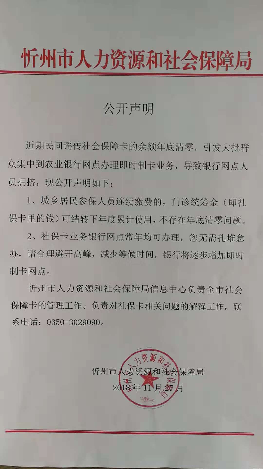 近期民间谣传社会保障卡的余额年底清零,引发大批群众集中到农业银行网点办理即时制卡业务,导致银行网点人员拥挤,现公开声明如下: