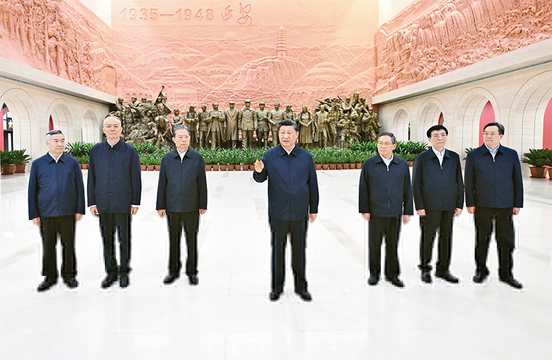 2022年10月27日,中共中央总书记、国家主席、中央军委主席习近平带领中共中央政治局常委李强、赵乐际、王沪宁、蔡奇、丁薛祥、李希,瞻仰延安革命纪念地。这是习近平在延安革命纪念馆参观《伟大历程——中共中央在延安十三年历史陈列》结束时发表重要讲话。新华社记者 燕雁/摄